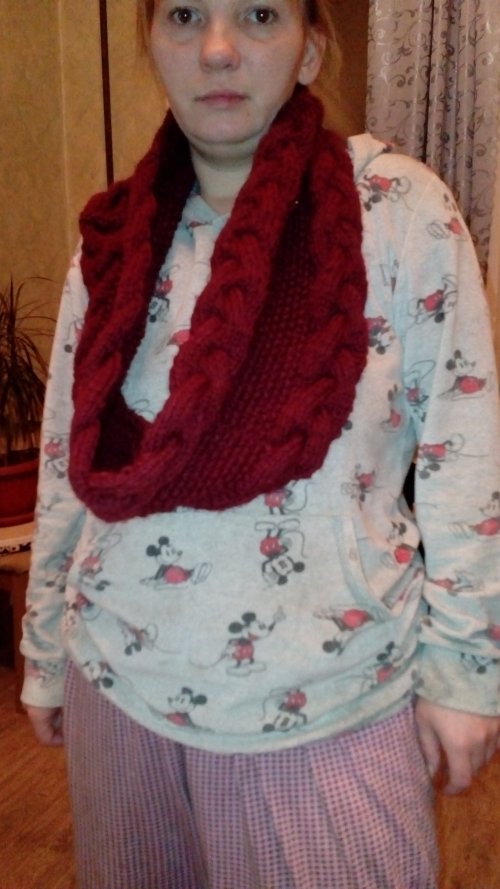 вот такой снуд у меня получился только вот я не удачно получилась я до сих пор болею так что извините.