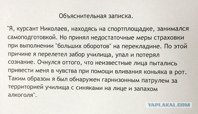 Приходит военный домой после трудного рабочего дня, и застаёт жену с любовником. Выхватывает пистолет, а любовник прыгает в окно. Военный пытается его схватить и хватает его за член, но любовник и тут вертляво выскальзывает и убегает. Тогда вояка выпускает в него всю обойму, но ни одна пуля не попала. Злой идёт на кухню, выпивает стакан водки и с досадой бурчит себе под нос: — Бл.. ть, и х.. й вытер, и проводил с салютом!