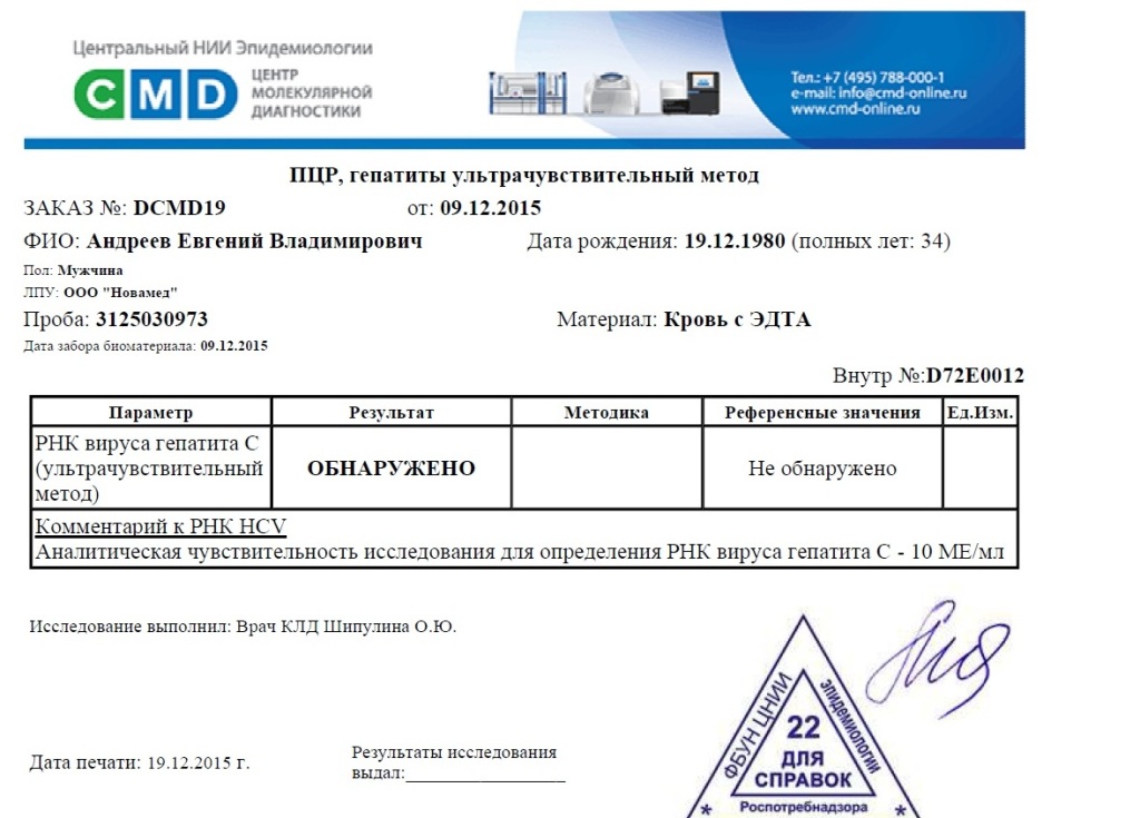 Всем привет, сегодня в нашем городе открылся офис CMD, я первый клиент, в 07:30 сдал ультра качество 1950,00 руб. Сегодня 3 недели как я закончил ПВТ. 19 числа день рождение, надеюсь получить подарок судьбы. Очень переживаю, анализы будут готовы только через 10 дней.