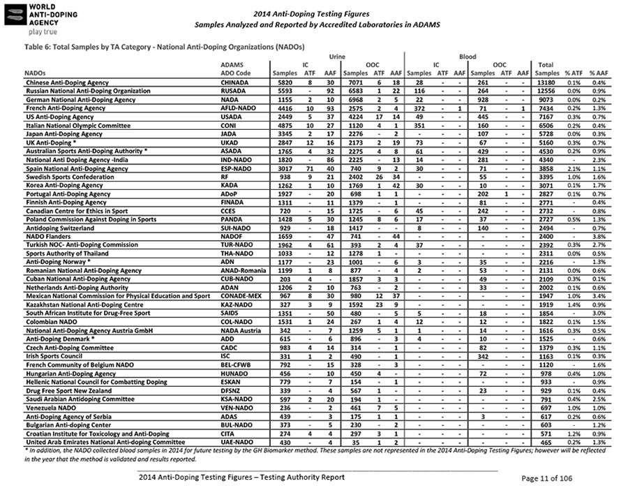 В грубом приближении, чем больше население, тем больше спортсменов. И вопрос, участников чего? ОИ 2014? Так данные WADA не только по ОИ 2014, а за весь 2014 год. Это надо искать сколько всего спортсменов было у стран(и не просто спортсменов, а тех у кого могут взять пробы). А это долго. Если есть желание сделай. Покажи, что к примеру у Германии или Швеции, спортсменов больше, чем у РФ. А так это просто трёп.Murgatroid писал(а):более правильно было бы считать от количества спортсменов, но искать лень
