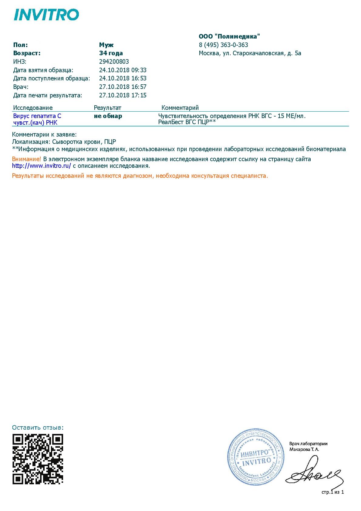 На прошлой неделе, 23.10 закончились 12 недель с начала ПВТ. Я, естественно, пошел сдать очередной раз ПЦР 15 МЕ, в этот раз в Инвитро, т.к. хотел и от них услышать заветное НЕ ОБНАРУЖЕНО, как уже было после 10 недель в КДЛ. И вот, спустя 4 дня ожидания... я его получил!!!