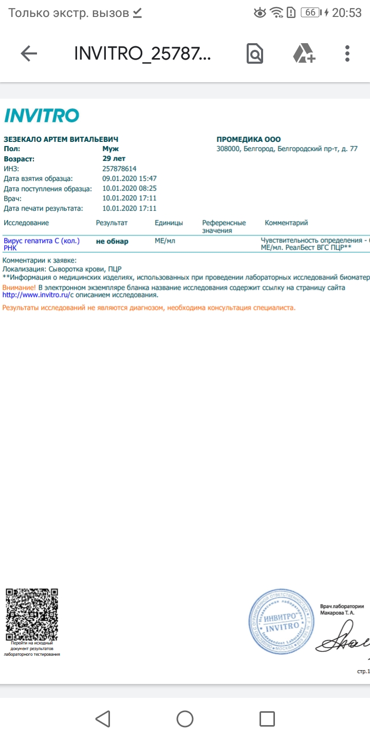 14.12.2019 г. Конец ПВТ: ПРЦ 60 ме/мл не обнаруженно;