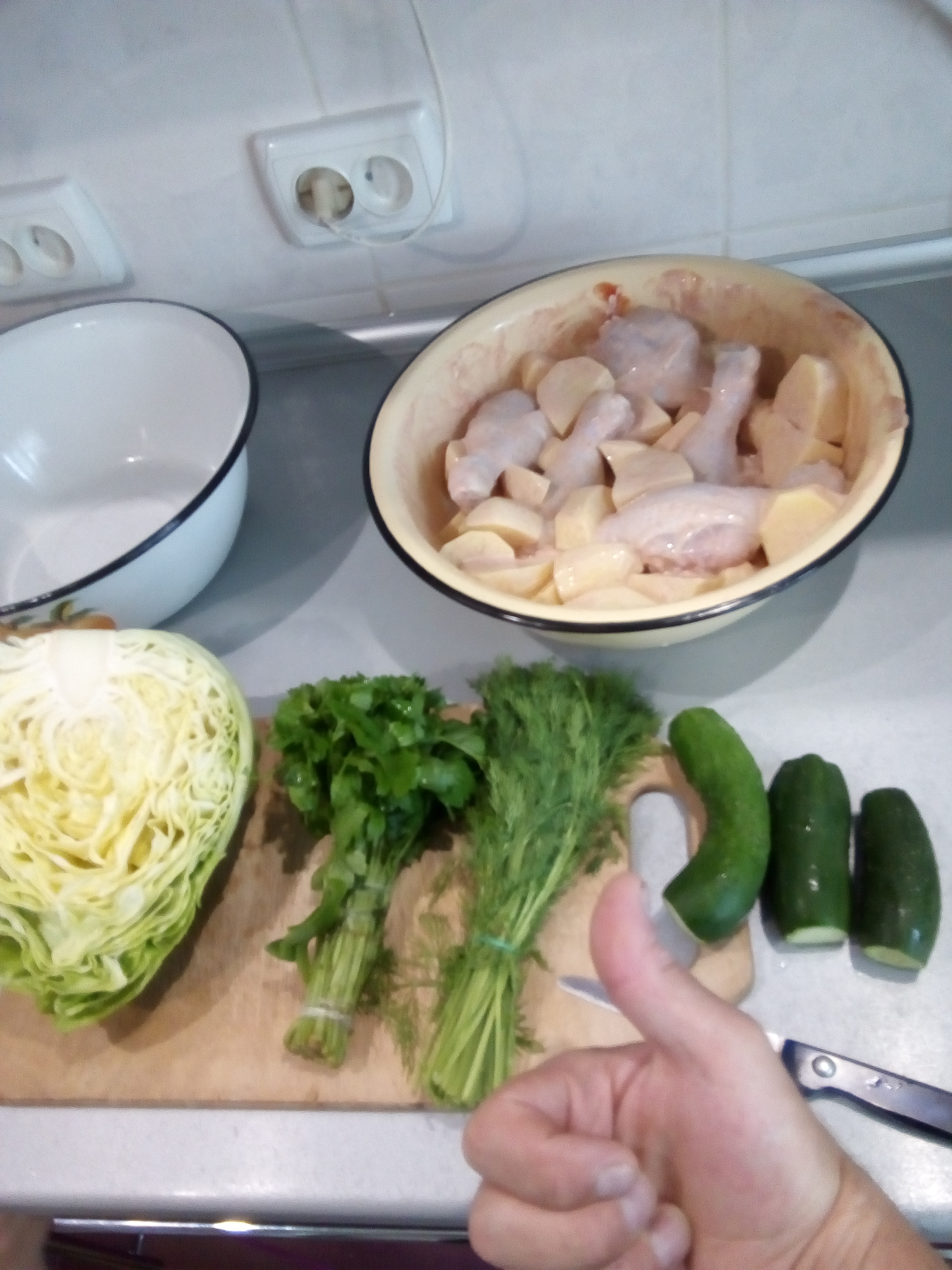 Наш ужин.Картошечка с мариноваными ляшками,салатик из всего свежего