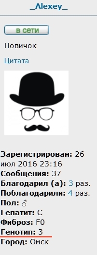 Конечно есть, я такой, под ником смотрите там написано у кого какой генотип и фиброз.Yarmik писал(а):А здесь кто нибудь есть с 3 генотипом?