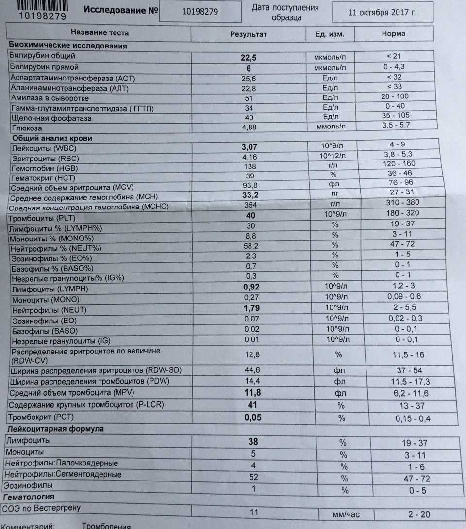 Никак тромбоциты не пойдут вверх. Хотя в сентябре были 63. А теперь 40 (