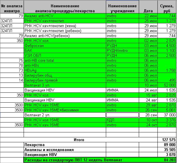 Как и обещал, выкладываю здесь мини-отчет о затратах на диагностику и лечение (лето 2018, Москва). Поскольку остались все бумажки, удалось собрать и восстановить полную картину. Когда в первый раз узнал о своем гепСе, начал искать информацию, что с этим делать. Первые же источники, на которые наткнулся, сразу же начали пугать миллионными суммами стоимости лечения, что чуть было не отбило желание действовать вообще. Слава Богу, попал на наш замечательный форум, где благодаря всеобщей поддержке, разузнал что и как, собрался с мыслями и начал действовать. Как видно из отчета, сумма на стандартную ПВТ выходит примерно 84 т.р., что конечно немало даже для Москвы, но, с другой стороны, учитывая, что эти расходы распределяются на несколько месяцев (в моем случае 4) и на кону стоит жизнь и здоровье, а также благополучие не только собственное, но и всей семьи, собраться с силами и найти эти деньги можно (в отличие от тех миллионов, которыми пугают другие ресурсы). В моем случае расходы получились в 1,5 раза больше, т.к. были приобретены еще 2 банки леков (для перестраховки из-за позднего минуса), вся диагностика (в т.ч. и семьи) делалась в платных лабах, а также прививки от ВГВ делал тоже за деньги (с отлучениями с работы проблема: сильно распространяться о своем недуге не хотел, соответственно, проводить часы в ожидании в нашей районке не мог).