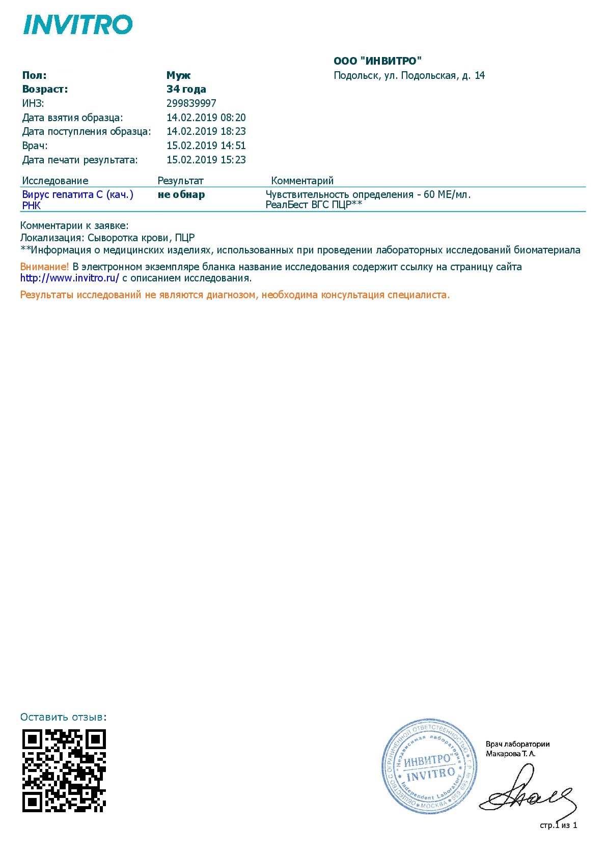 14.02, спустя 12 недель и 2 дня после ПВТ, сделал ПЦР-ку (как обычно, в Инвитро), 15.02 сделал глубокий вдох, открыл сообщение и... с облегчением выдохнул, получив заветный минус!!!