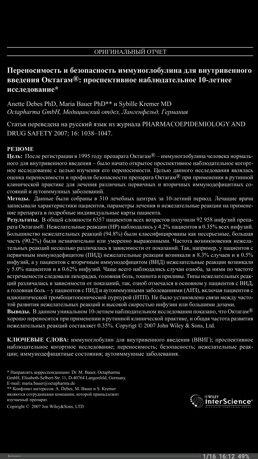 Ну, как бы ...зарегестрирован в 1995 году, 10 лет исследований., более 20 лет применения...Данные собирали в 310 лечебных центрах, 6357 пациентов и 92 958 инфузий....встречаются побочки, как и везде, но в основном редкие.Прикрепляю файл с исследованием.