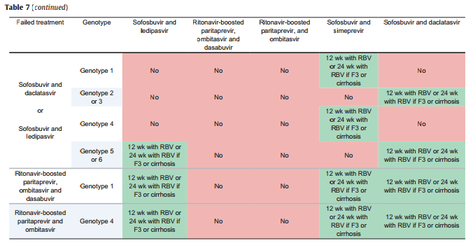 Хочу обратить внимание, что в переводе на русский язык нет продолжения таблицы7. Эту информацию нашла здесь: viewtopic.php?f=4&t=14345&hilit=easl+2015&start=75 Там DaDDie об этом сообщил. Подняла рекомендации на английском и, правда есть продолжение. Кстати, там предлагается при повторной терапии после СОФ+ДАК схема СОФ+ЛЕД. Только если я правильно поняла, а то англичанка я ещё та....Sauvagesse писал(а):И потОм...В европейских рекомендациях на 2015 года схема пег+риб+соф есть, а вот при рецидиве что делать после такой терапии - ни слова для первого генотипа