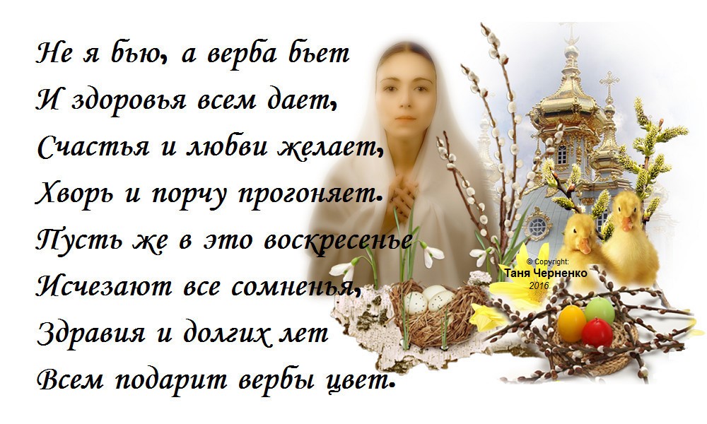Просыпается мир, просыпается природа, просыпается сама жизнь и распускаются вербы. Души людей, умываются весенними дождями и в этот святой праздник становятся чище и радостнее. Я пожелать вам хочу, чтобы каждый из вас впустил в сердце любовь ко всему живому. Возрадуйтесь новой весне и новым событиям. Принимайте, все, что посылает вам бог с благодарностью. Пускай удача всегда и во всем сопутствует вам, а молитва всегда помогает. С праздником Вербного Воскресения!