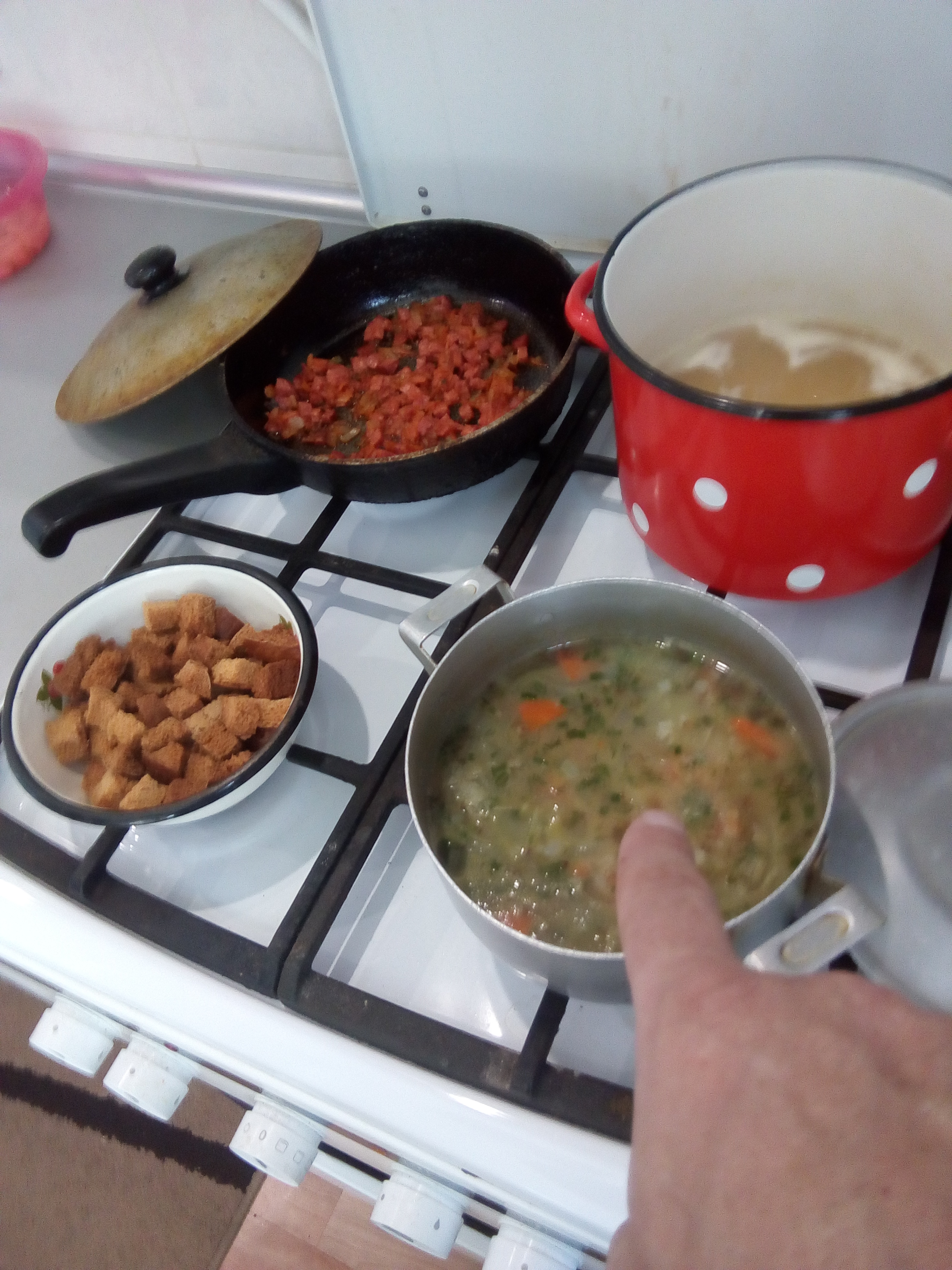 Nickolas, тот что под рукой,это мой,диетический.А тот что кипит,для моих.Гороховый,с копчеными ребрышками,и сухариками.Мммммм,ням-нямка.