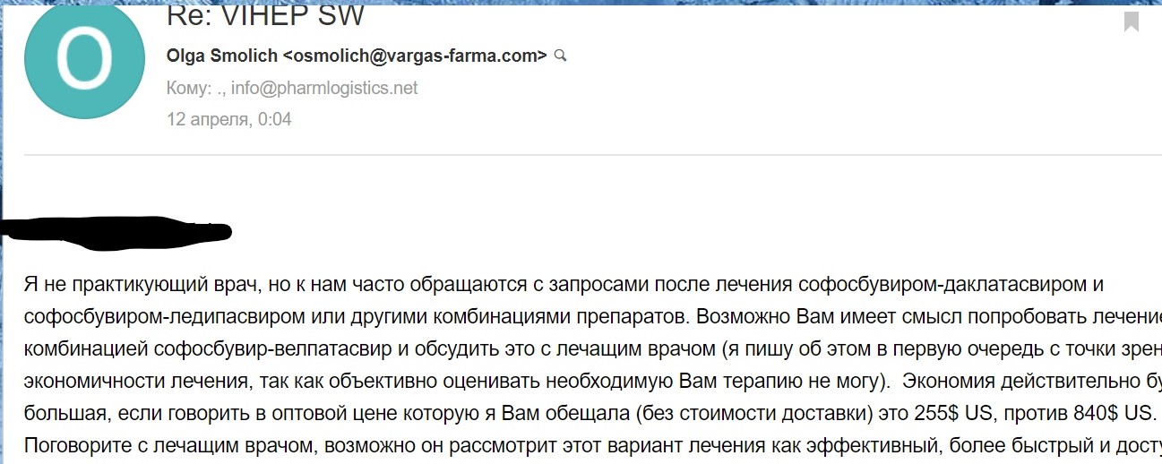 Посмотрите 2й скриншот на этой странице viewtopic.php?f=22&t=23376&start=150 мне кажется что я ее правильно понял.Остальных вопросов кроме себестоимости я не обозначал.Gudvin писал(а): ↑29 июн 2018 10:47Владимирр, в скрине, насколько я понял, ценник $255 касается соф+вел, а не соф+вел+вокс. По чём его продают в розницу, мне не известно. Насколько я знаю, на нашем форуме венесуэльскими препаратами в специально отведенном для этого разделе, не торгуют. Что там "толкают" в личках, мне также не известно. Так как жалоб на данную деятельность от приобретателей не поступает, значит всех всё устраивает.