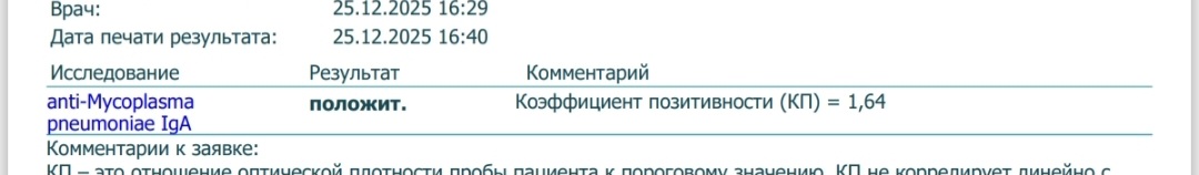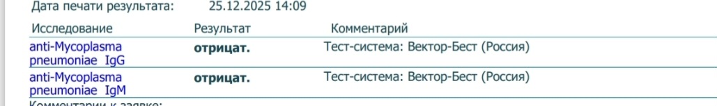 Всем привет! Назрел вопрос. Заразил меня сынуля-пятилетка микоплазменной наверное пневмонией. Началось как орви. Тесты на грипп и ковид - отрицательные. Из симптомов - евстахиит, сопли, болело горло и жуткая боль за грудиной и сухой кашель с весьма скудной мокротой. Анализы вирусные, но весьма спокойные.Терапевт через 6 дней от острой фазы, проведя аскультацию, назначил амоксиклав. Я пыталась требовать лекоклар, но фиг вам. Вчера мне закрыли больничный. Оак - идеальный. Состояние бррр, ну только что хрипы ушли. Я во вторник сдала сама в инвитрона три иммуноглобулина к микоплазме. Сегодня пришли результаты. Может кто-то может помочь и расшифровать? Мазок из носоглотки сдать не могу - у нас в Минске с этим проблема, я про платный вариант