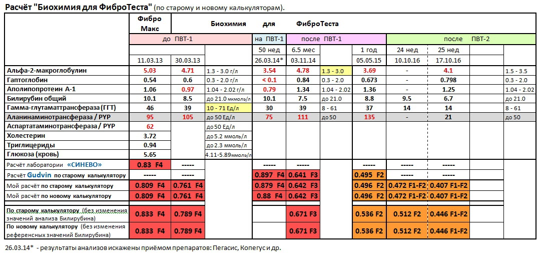 1) Несколько раз читал, что люди жалуются, что при расчёте одного и того же анализа на старом и новом калькуляторе результат на новом меньше чем на старом. Решил пересчитать все свои анализы на обоих калькуляторах. Если для старого калькулятора результаты анализов, референсные значения которых отличаются от тех что в калькуляторе, привести к референсным значениям калькулятора то рассчитанное значение фиброза по обоим калькуляторам будет одинаковым.aleks_aleks писал(а):по данным Синево 2014, фиброз 1-2 (0.42) по их значениям.