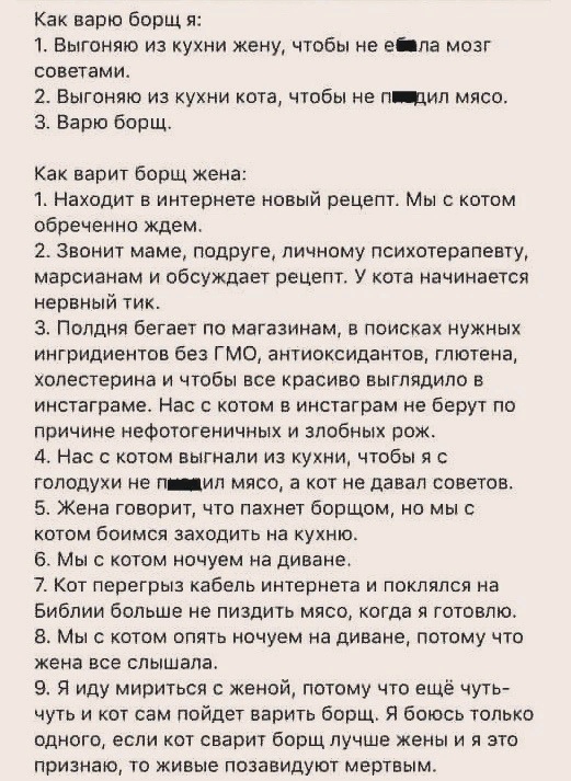 «Дорогая редакция. Спасибо вам за вашу заботу. Мы всё сделали так, как вы написали. Муж мой, Изя, сел на стул, а я попыталась сесть сверху, для чего придвинула к стулу стол и уже с него стала спускаться, скользя по телу мужа. Он в это время пытался стимулировать, готовясь проводить толчки и фрикции. Но именно в это время наша кошка Муська, видно испугавшись нашей композиции, кинулась нас разнимать и при этом вцепилась когтями в живот мужа. Муж рванулся, и мы оба грохнулись на пол. Сейчас, когда я пишу вам это письмо, мы оба находимся в гипсе. Однако мы ещё не старые, отказываться от секса не собираемся, и просим вас, подскажите нам позу, при которой и мы могли бы получать наслаждение, а кошка наша, Муська, не очень пугалась.