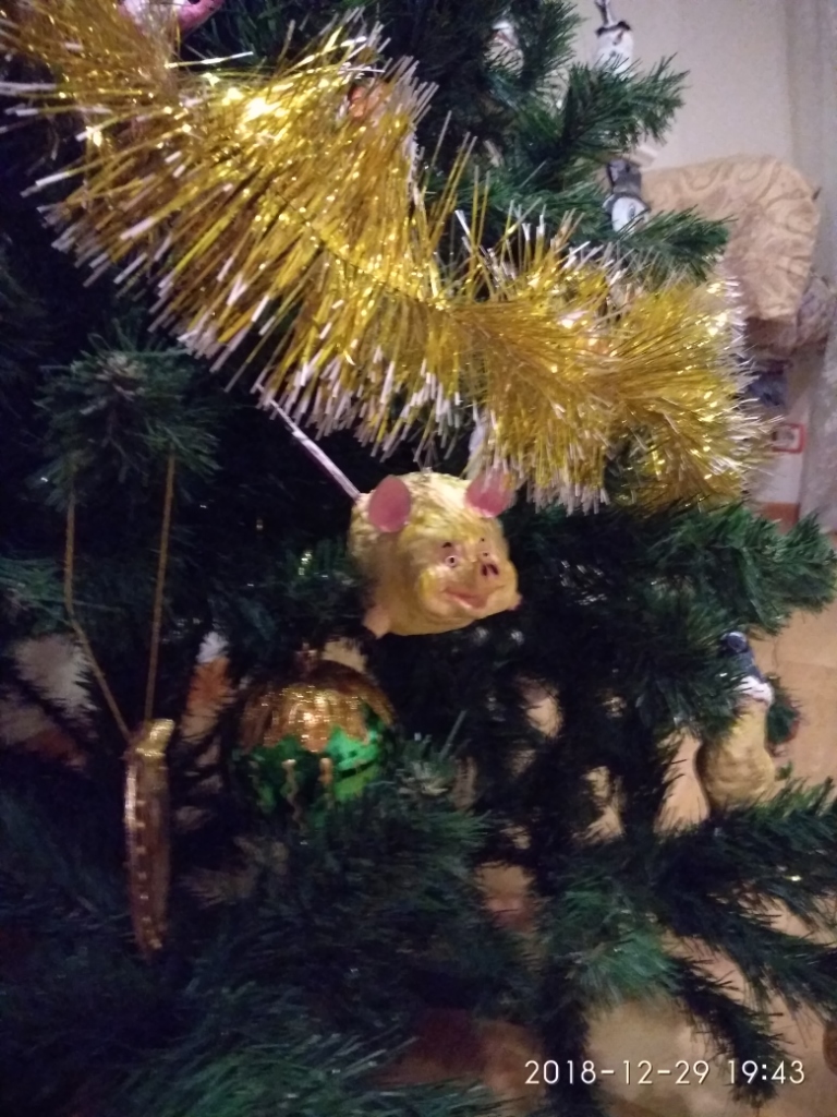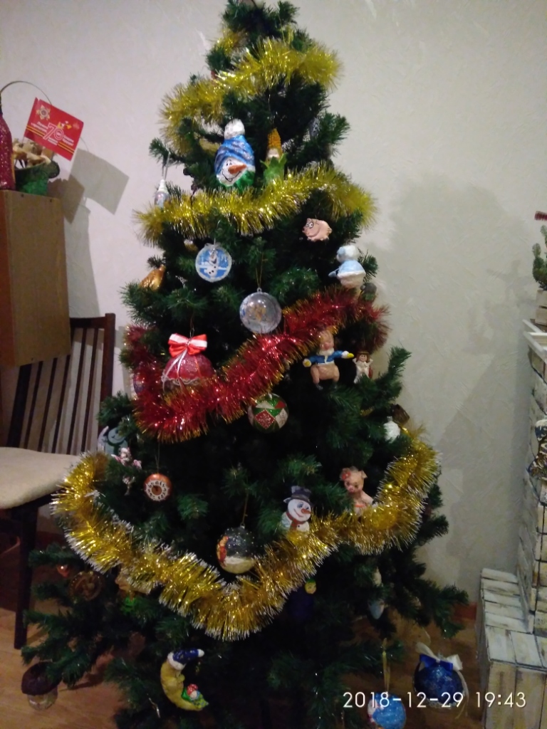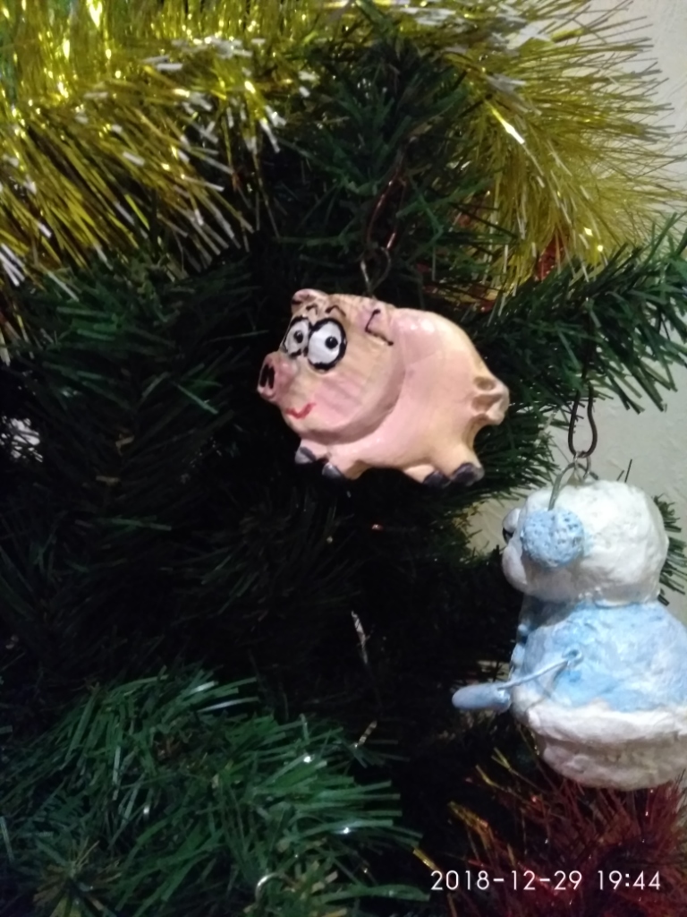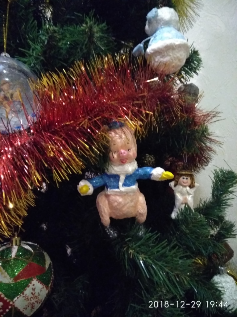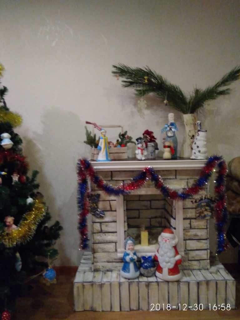 немножко свинства конца прошлого года. Игрушки в основном папье-маше, обычное и ватное, елка в этом году искусственная, но игрушки на елке все самодельные. Камин- с картонных коробок за пару вечеров собрала