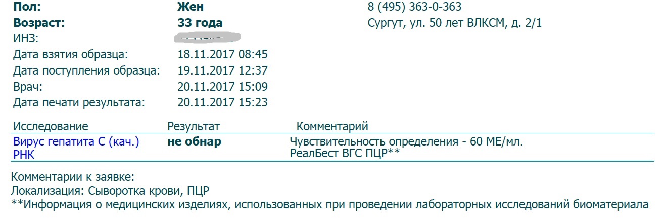 На 2017 год: гепатит С, 1b, F-0, УЗИ в норме, количество 327954 ме/мл