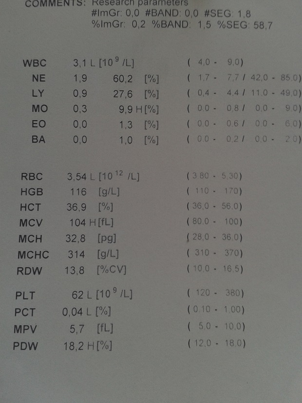 сегодня получила очередной укольчик Пега, есть немного хороших новостей, уже 4-я неделя без Нейпомакса и тромбоциты уже 89 (ручной подсчет - 105) от прежнего показателя 79... Воть