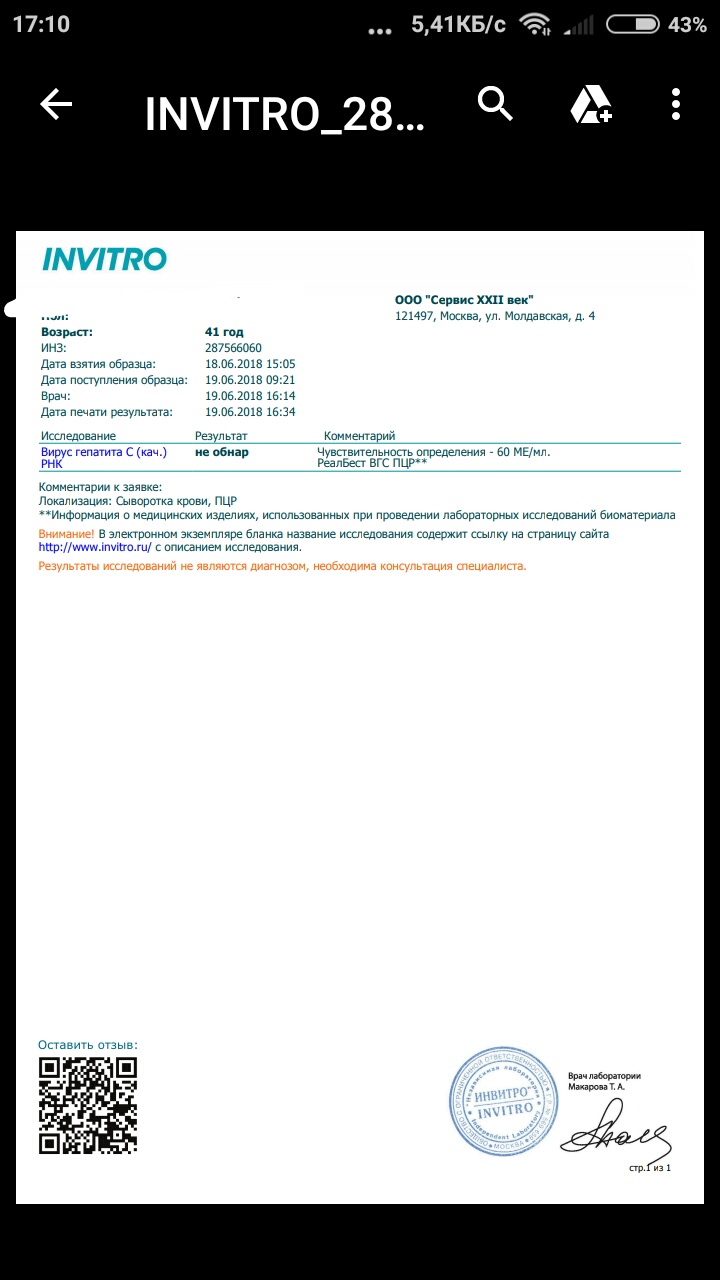 ПЦР 4 нед (-) 60ме Инвитро