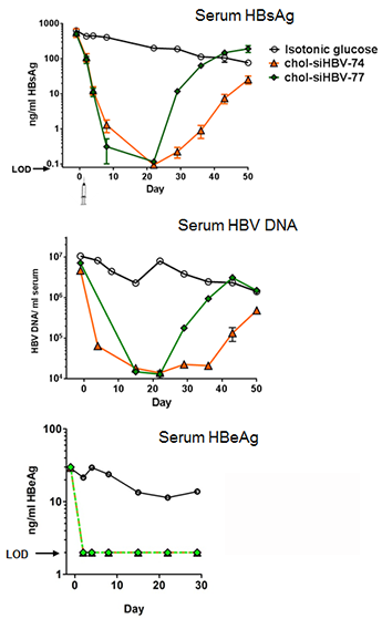 В животных моделях инфекции hbv, один ко-инъекции ЦОД доставки транспортного средства с холестерином-конъюгированная siрнк таргетинг последовательностей ВГВ привел в мульти-лог подавлению ВГВ РНК, белков и ДНК вируса с длительной продолжительности эффекта.