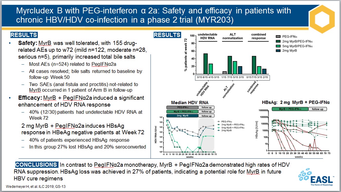 В исследовании фазы 2 MYR202, монотерапия MyrB привела к снижению РНК HDV и улучшению уровня ALT