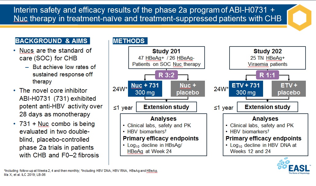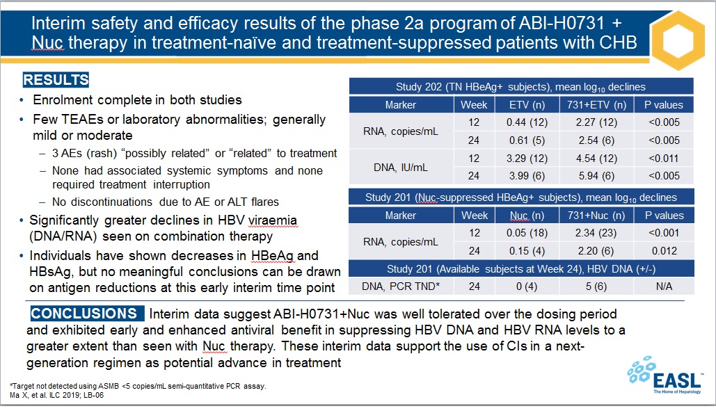 ВЫВОДЫ Промежуточные данные свидетельствуют о том, что ABI-H0731 + Nuc хорошо переносился в течение периода дозирования и продемонстрировал раннее и усиленное противовирусное действие в подавлении уровней ДНК HBV и РНК HBV в большей степени, чем при терапии Nuc. Эти промежуточные данные подтверждают использование КИ в схеме следующего поколения в качестве потенциального прогресса в лечении
