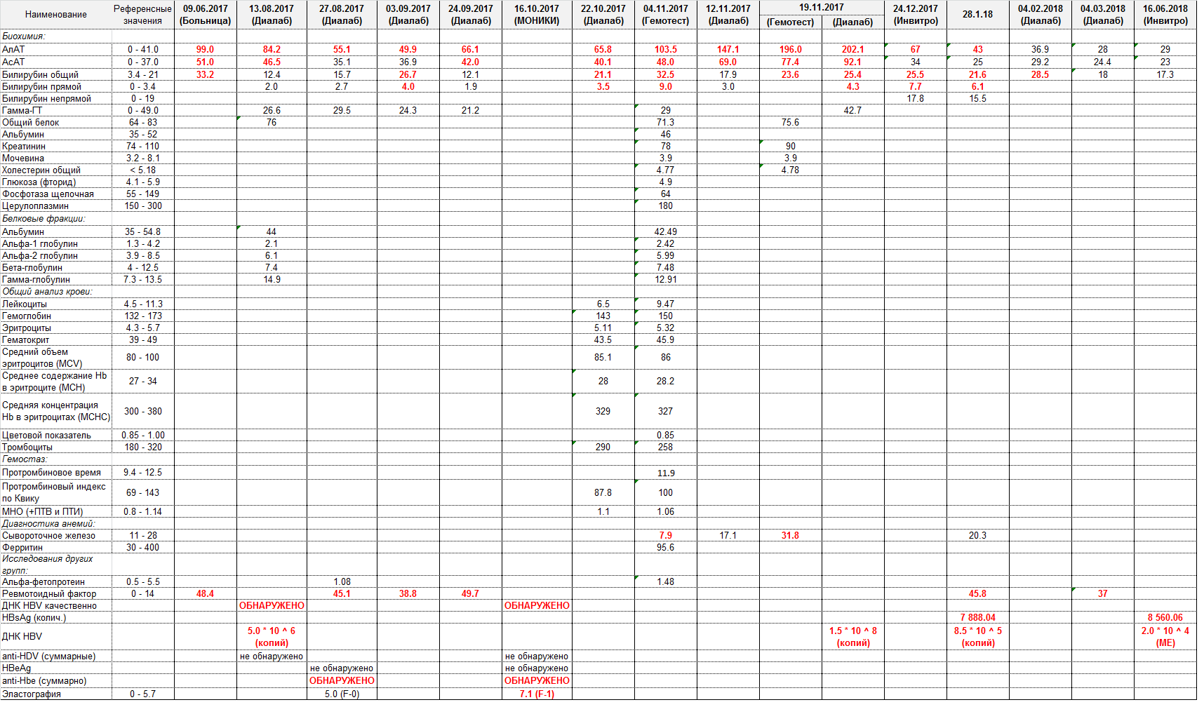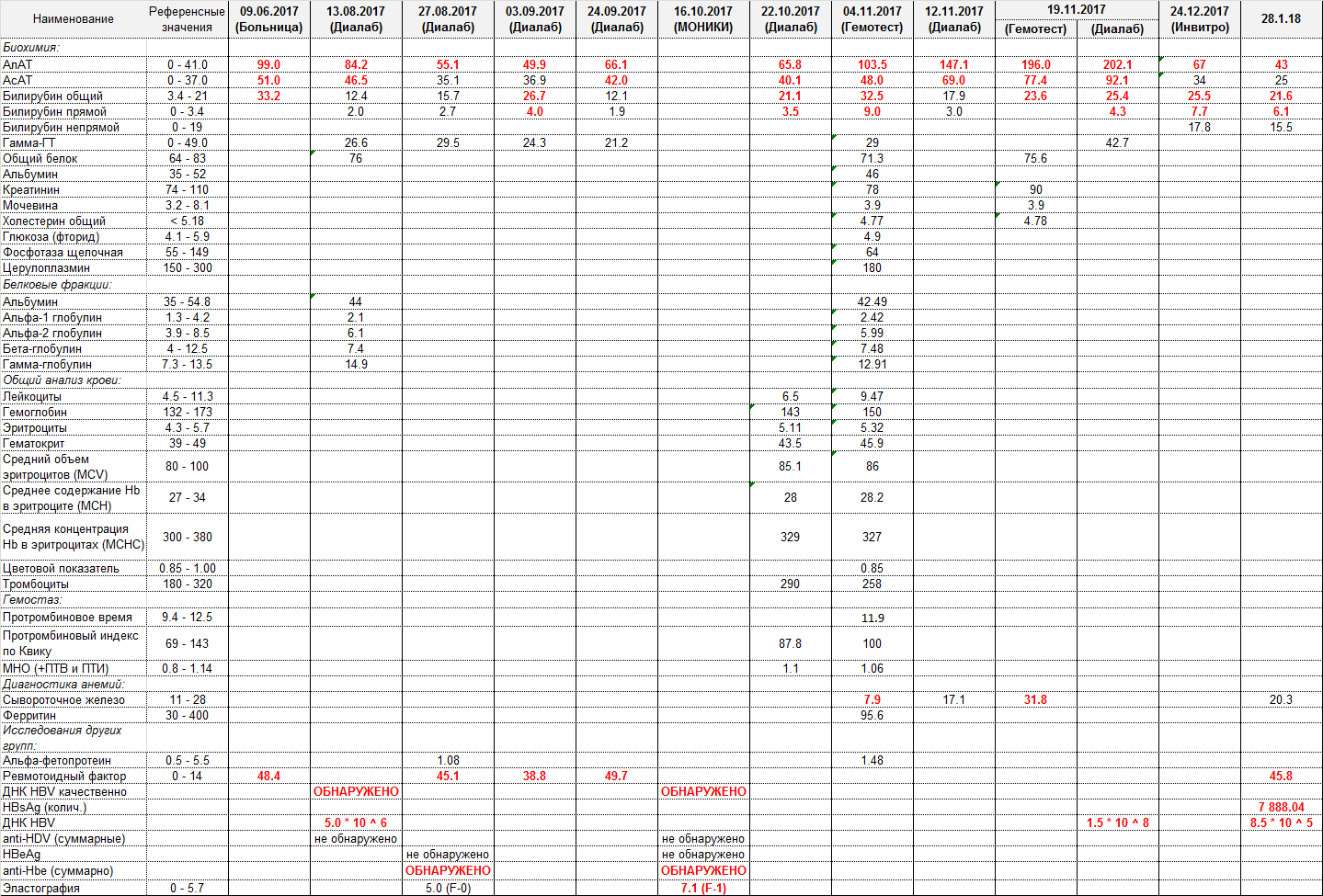 Ноябрь 2017г.: АЛТ-202; АСТ-92; ДНК HBV-1.5*10^8 копий; Биопсия-F-2; HBsAg-7 888.