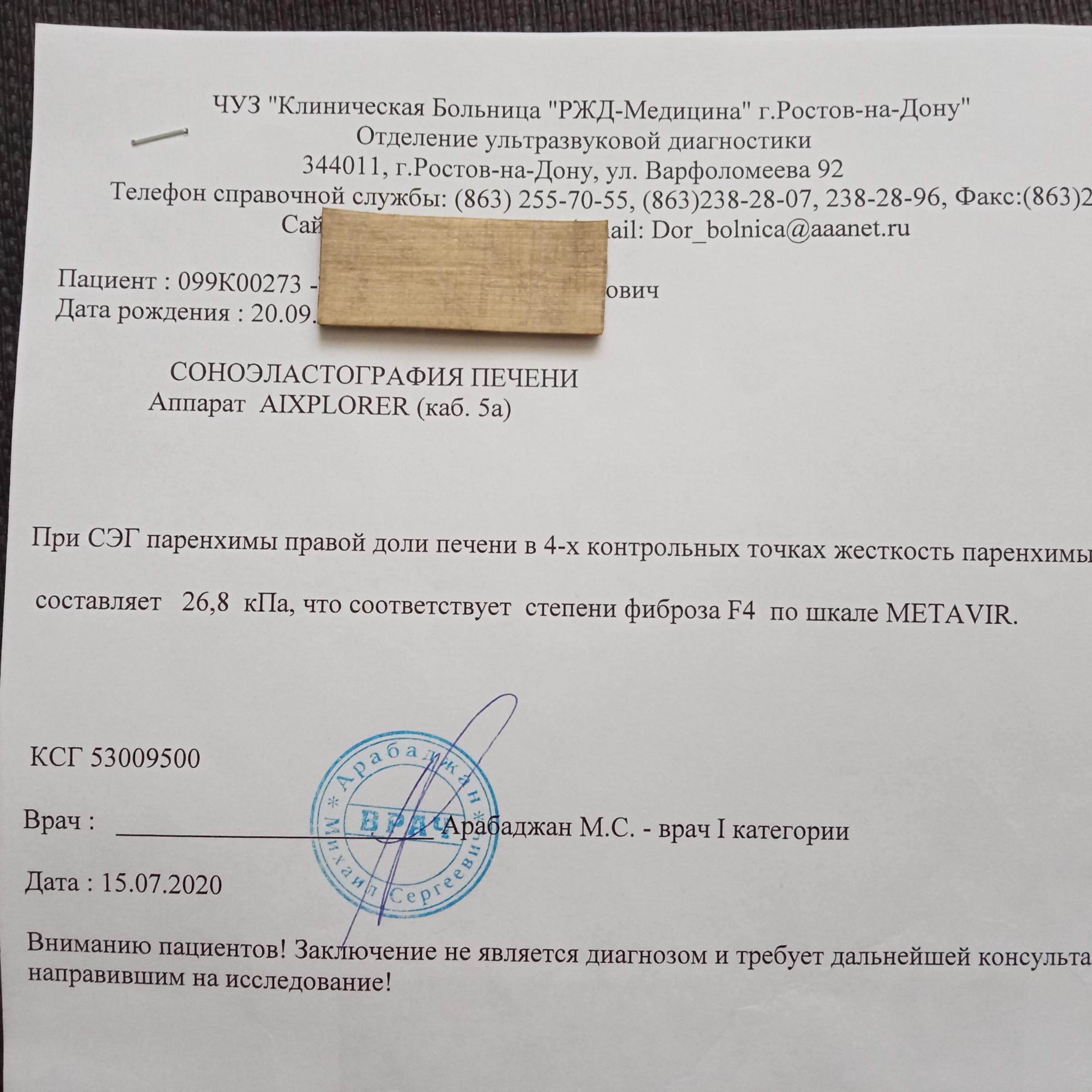 15.07.2020 F4 28,6кПа, ГепС, генотип 1, 3,8*10⁶