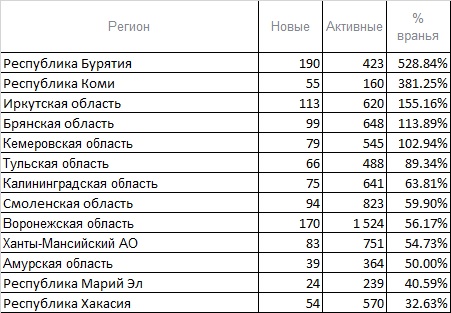 Сильный рост в Москве, она перешла на 4 место, высокий рост в Костроме, Липецке, Алтайском крае, Приморье и Новосибе, небольшой рост Псков, Татария, Пермь.