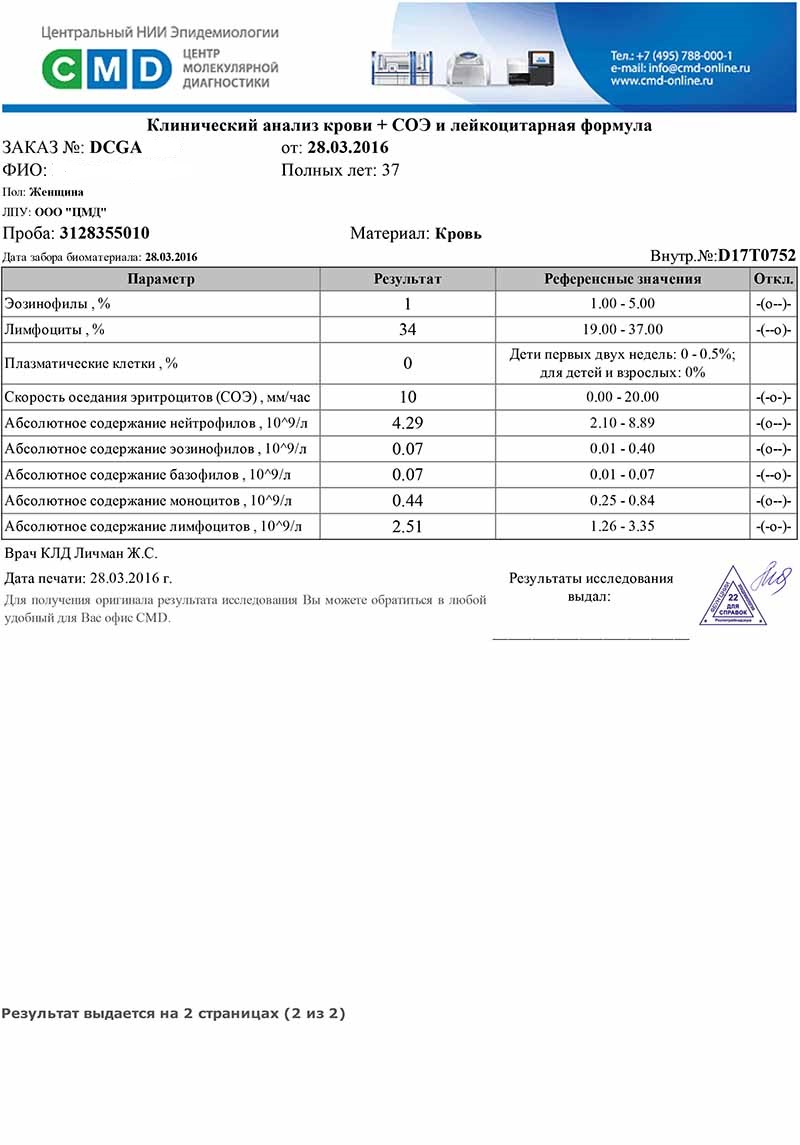 Здравствуйте! Подняла! Поднялись как моноциты, нейтрофилы, так и лейкоциты (были 2,9!!! Совок писал что у меня лейкопения в острой форме.) Пила 2 недели Пентовит (витамины В1,В12, фолив.кислота) по 2 таблетки 3 раза в день, правда эти витамины поднимают заодно тромбы-но это не страшно. Получила сегодня анализы, выкладываю. Отмечу, что и лимфациты упали -чему очень рада! Были 45! Сейчас норма. Осталось 6 дней до конца терапии...Марина2009 писал(а):SNEZHOK Добрый день! Увидела ваше сообщение у Сергея Совка про пониженные моноциты и нейтрофилы. Вы как нибудь их подняли?