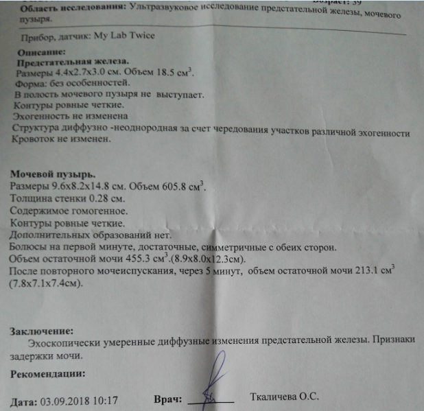 В общем сделал я узи простаты,но вроде всё хорошо! Единственное остот мочи есть в мочевом,говорит что это не хорошо! Но так как меня за 2 часа заставили 1,5 литра воды выпить,у меня пузырь растянулся так что потом за раз всё н смог слить! Читал что это не правильное определение! Ладно с урологом потом решу! Хоть простата в норме!