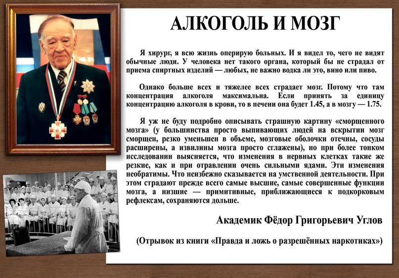 А про мозг, который Углов видел на вскрытии... ну вот эти слова про "большинство просто выпивающих людей" - как-то очень неконкретные и бездоказательны. Он что, видел мозги БОЛЬШИНСТВА ЛЮДЕЙ? И что это за "просто выпивающие"? Подозреваю, это как раз были выпивающие крепко пациенты. А выпивающих немного он по результатам вскрытия относил к трезвенникам. И не факт, что такие жуткие изменения были вызваны именно употреблением алкоголя, в жизни масса других вредностей, а у кого-то просто слабые сосуды от природы...