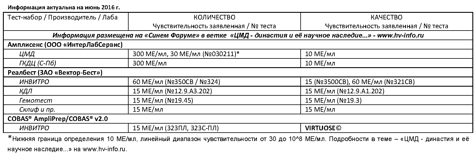 - ЦМД, Больница Боткина (СПб), ГКДЦ (СПб) - АмплиСенс - по-которому имеются публичные результаты одного независимого клинического исследования и краткие результаты по одному неклиническому исследованию на базе которых можно сделать некоторые выводы относительно достоверности их заявленной чувствительности - 10 МЕ/мл. Также недавно был введен количественный тест с нижней границей определения 10 МЕ/мл и линейным диапазон чувствительности от 30 до 10^8 МЕ/мл. Подробности читайте выше.