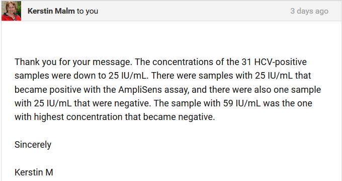 Разъяснения пришли от первого автора упомянутых тезисов - Керстин Малм:Virtuose писал(а): Сейчас, когда мы знаем (1) что затяжное «зависание» вируса на ингибиторной терапии на границах и за её нижними пределами порога чувствительности современных тест-систем является вполне естественным явлением, (2) и что АмплиСенс потенциально может определять РНК ВГС в образцах с минимальной концентрацией вируса 2.6 МЕ/мл (возможно, правда, что всего лишь в 1% случаев, но ведь смог же), то уже с большЕй вероятностью можно считать, что «+» от ЦМД не являются такими уж и ложными.