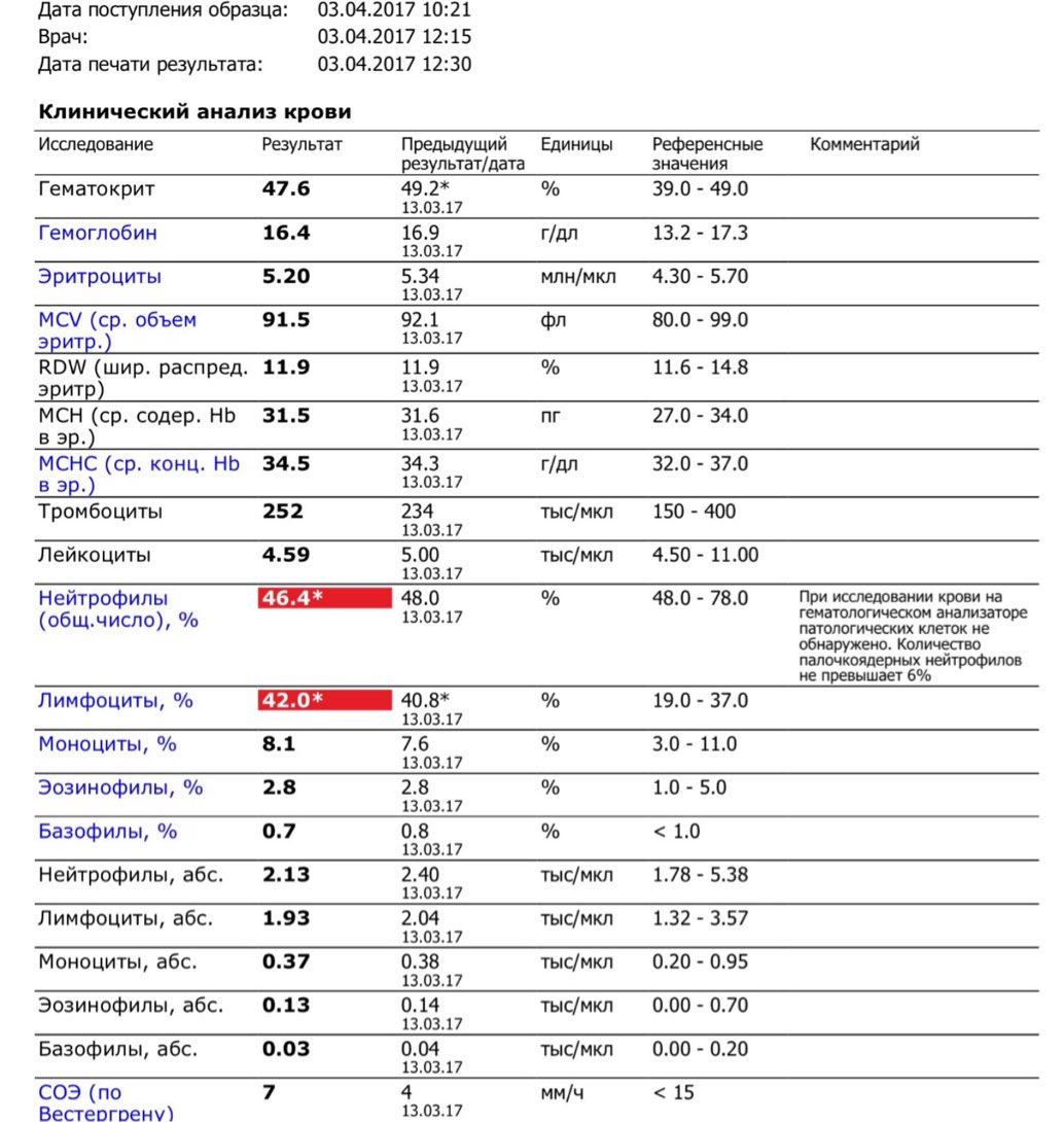 стабилизировался гематокрит, снова подросли тромбоциты, продолжают расти лимфоциты и ниже нормы упали нейтрофилы.