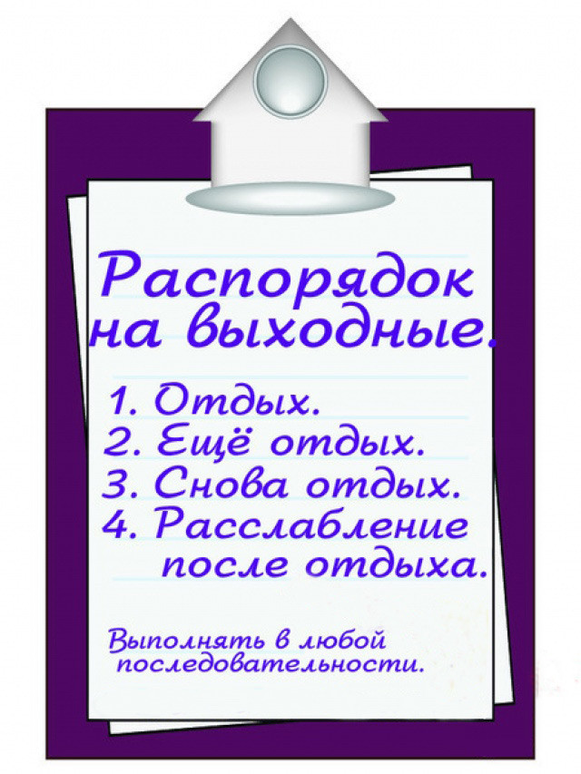 Люся! Распорядок выходного дня удалось выполнить наполовину: только первый и четвертый пункты с легкими изменениями...1. Отдых. 4. Работа - расслабление после отдыха!