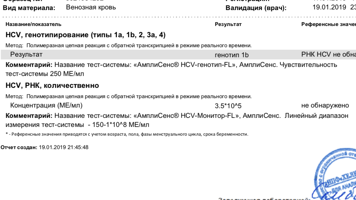 Вирусная нагрузка низкая. Генотип 1б, самый лёгкий, для ингибиторной терапии.