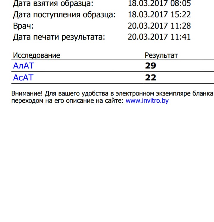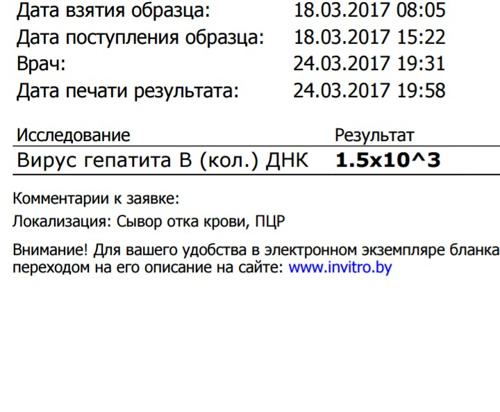 2017: март- ДНК HBsAg 1,2×10*3 ме/мл; HBsAg 4860 ме/мл, сент- ДНК HBsAg 5,8×10*3 ме/мл, дек- ДНК HBsAg 8,1×10*3ме/мл, HBsAg 4920ме/мл, геп Д-отр.
