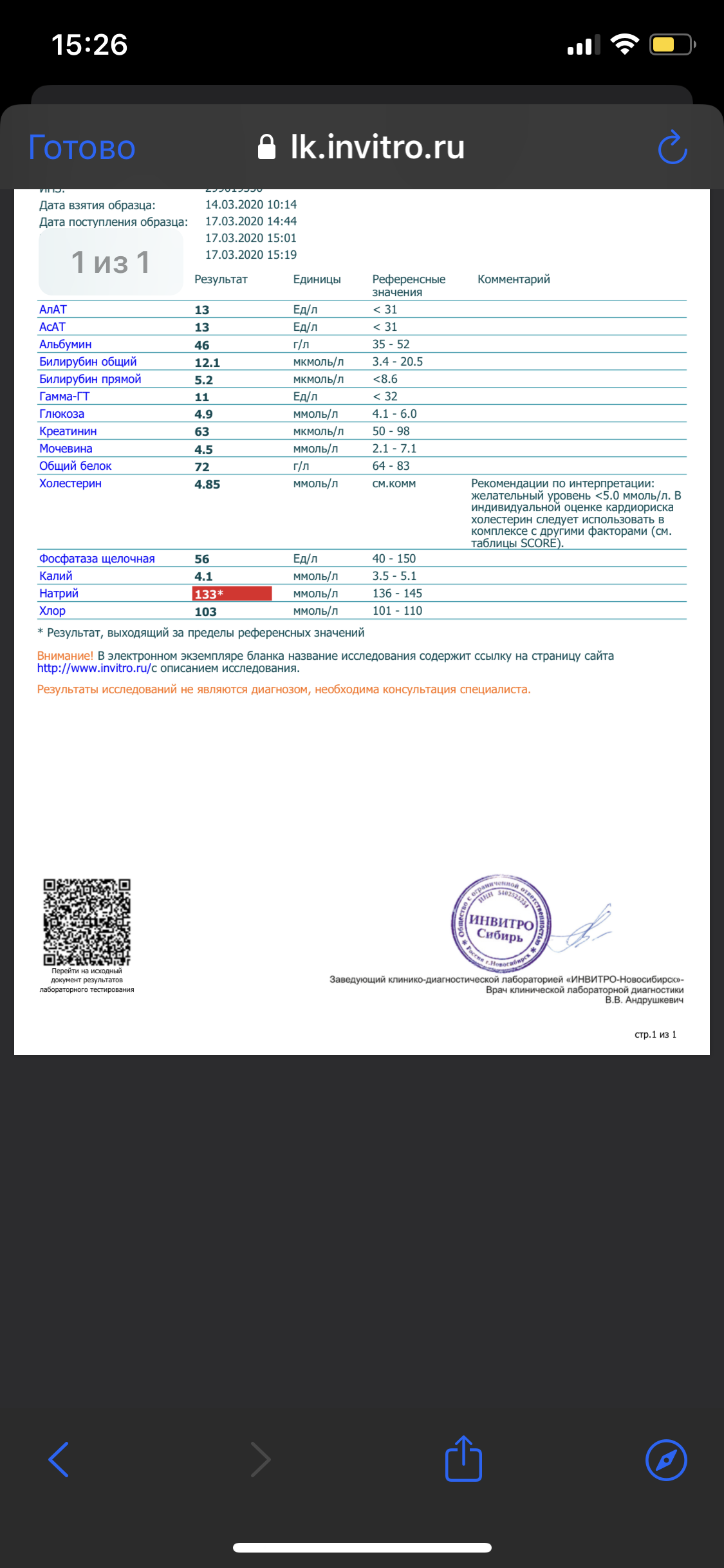 Ребята, скажите пожалуйста, почему может быть понижен натрий в крови? Норма 136. У меня 133..