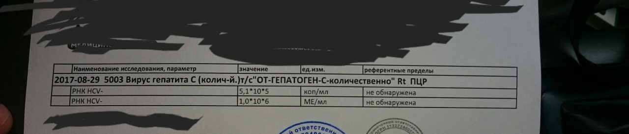 Геп.С, ген.1, F1-2,на 20.06.17 АСТ-47.5, АЛТ-78.0 в.н. 7,6х10*5 ME/мл