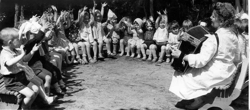 ещё у нас в садике была тётя Женя с баяном. Вот такая зарядка для малышей по утрам. конец 60-х