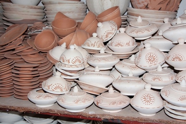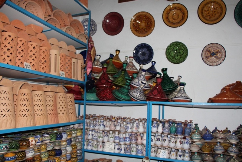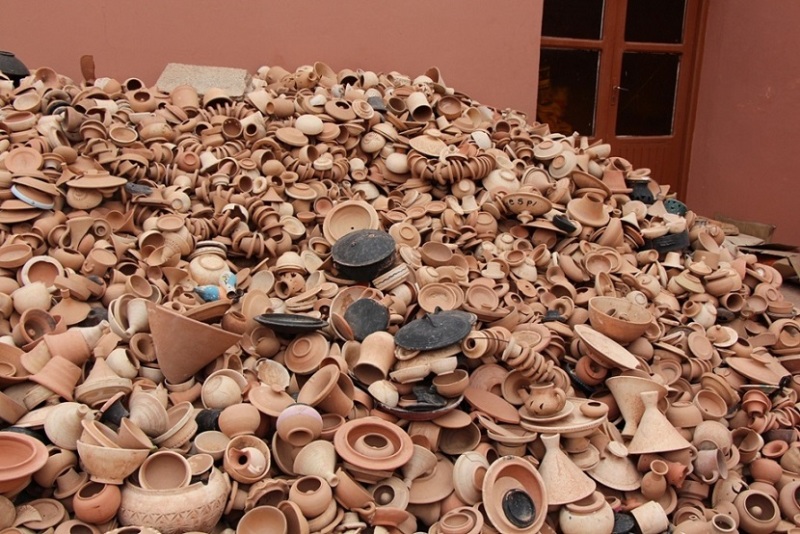 Её смачивают, делят на части, а потом уже на гончарный круг. Чего только не лепят! В основном, конечно, посуду. Вот тажины, например. Шкатулки, тарелки, пепельницы... Расписывают тут же. Расписывают по-разному. Если будут использовать для пищи, то блестящая краска, а если нет - то матовая. Вот эта матовая краска таких расцветок! Чёрный человек на фото - работник. Он такой няшка!... Он улыбался и отводил глаза. Я в него просто влюбилась! Скорее всего бербер(коренное население). Гора битой посуды - брак.