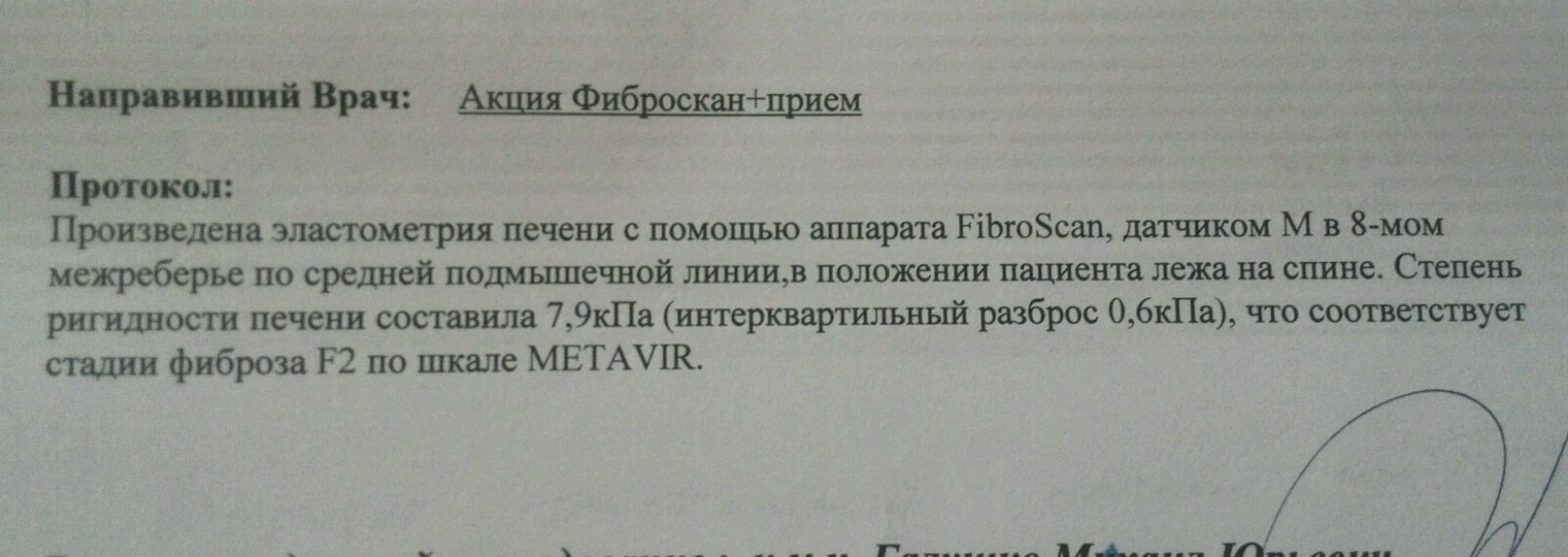 Фиброскан 08.2015 (11.0 КПа ) 01.2016 (10.4 КПа, 07.2016 -7,9кПа