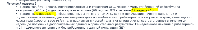 Сергей9899 писал(а): В принципе, достаточно 12 недель по схеме софосбувир+даклатасвир; продлевать терапию советуют только при циррозе печени