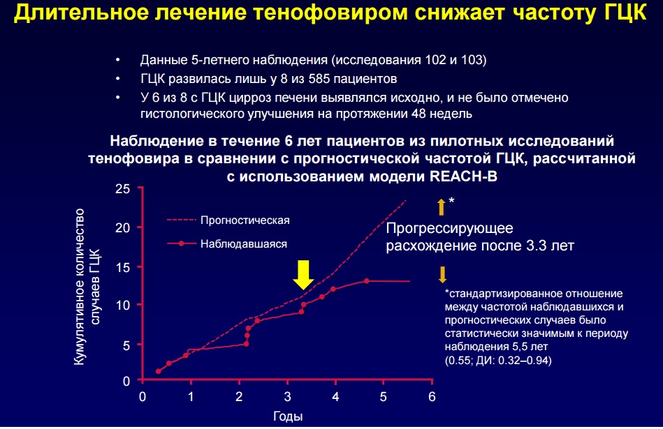 - Что показывает снижение, если считать, что ГЦК развивается у цирротических пациентов в ~14-15% случаях. (исходя например из исследования ниже):Долгосрочные клинические исходы у пациентов с циррозом печени и гепатитом В, получавших фумарат тенофовира дизопроксила до 5 лет (TDF). (348 пациентов)