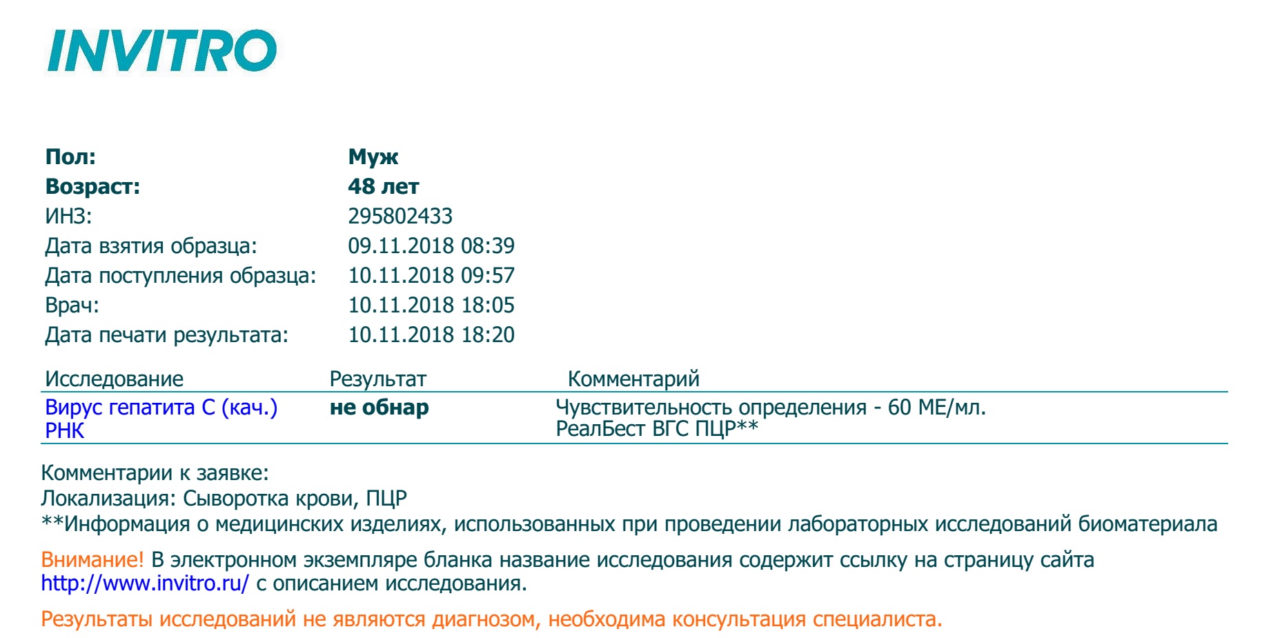 ПЦР 4 нед (-) 60ме Инвитро