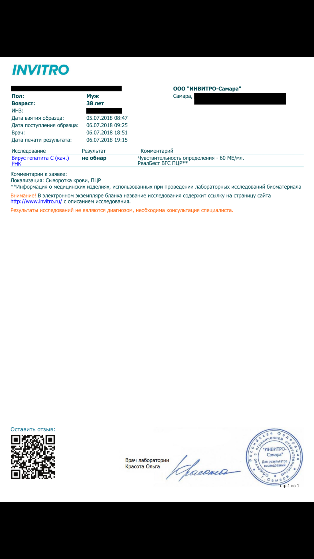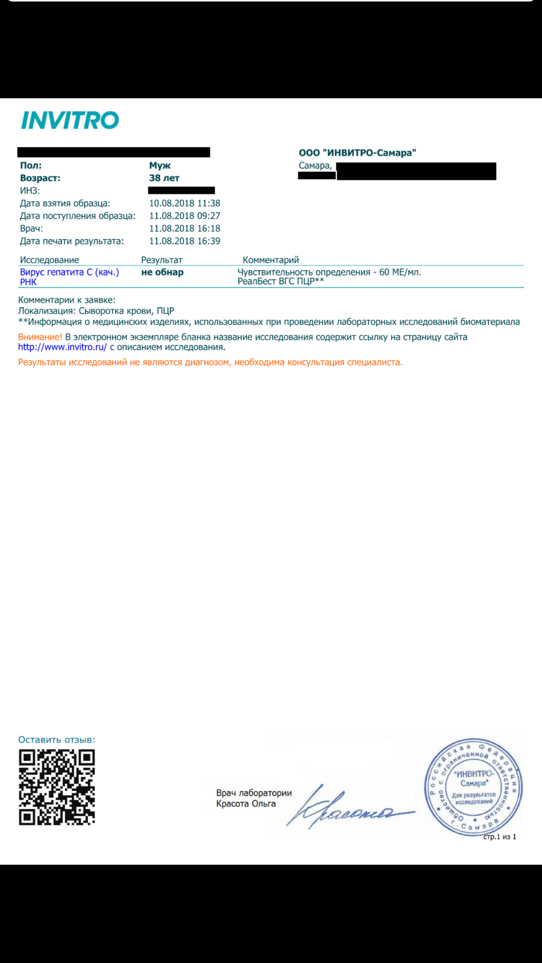 АЛТ и АСТ упали в 10 раз и пришли в норму. Тромбы подросли немного. Продолжал дальше и после 10 недели сдал повторно. Результат пцр как и до этого отрицательный порадовал!!!