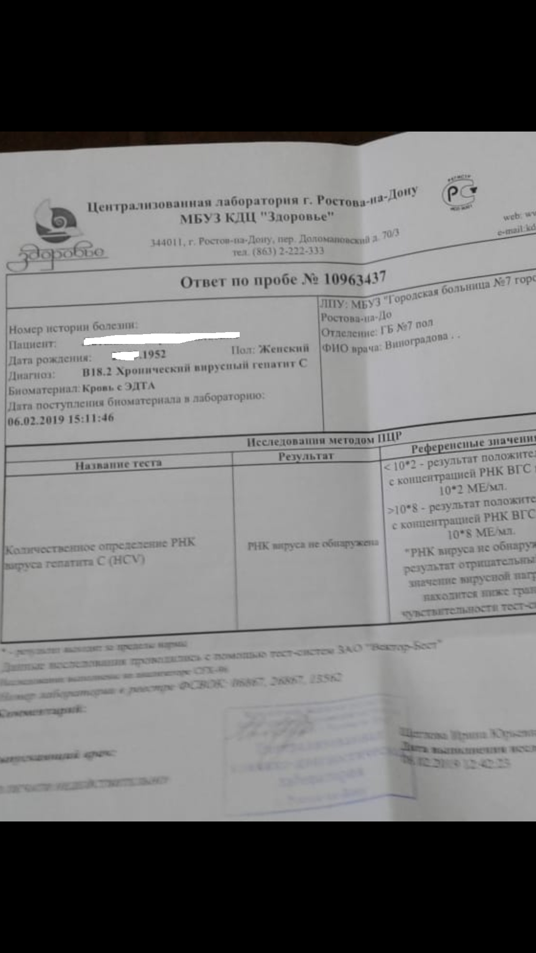 Всем привет! В общем, начали ПВТ 15 января, Соф+Вел+Рибаверин+диета. Первый анализ сдали 6 февраля, 15 февраля пришли результаты - вирус не обнаружен. Выкладываю фото анализов в плохом качестве, но разглядеть можно, при возможности заменю на нормальные) Какие наши дальнейшие действия? Может надо еще что досдать или пересдать? Гемоглобин и тромбоциты в пределах нормы (на нижней границе), АлТ и АсТ снизились.