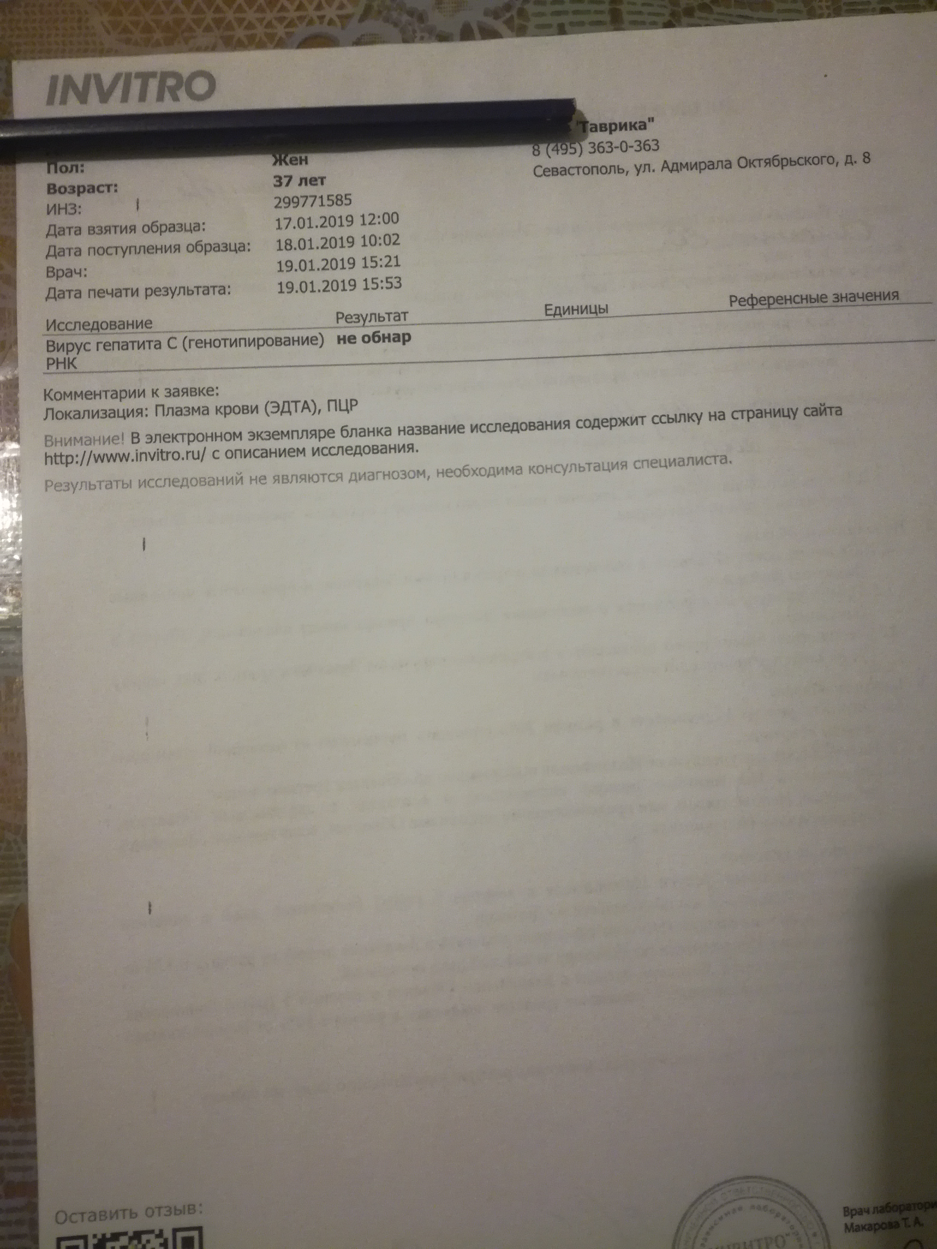 22/12/2018 - Кач.ПЦР -Не обнаружено (Инвитро 60 ме)