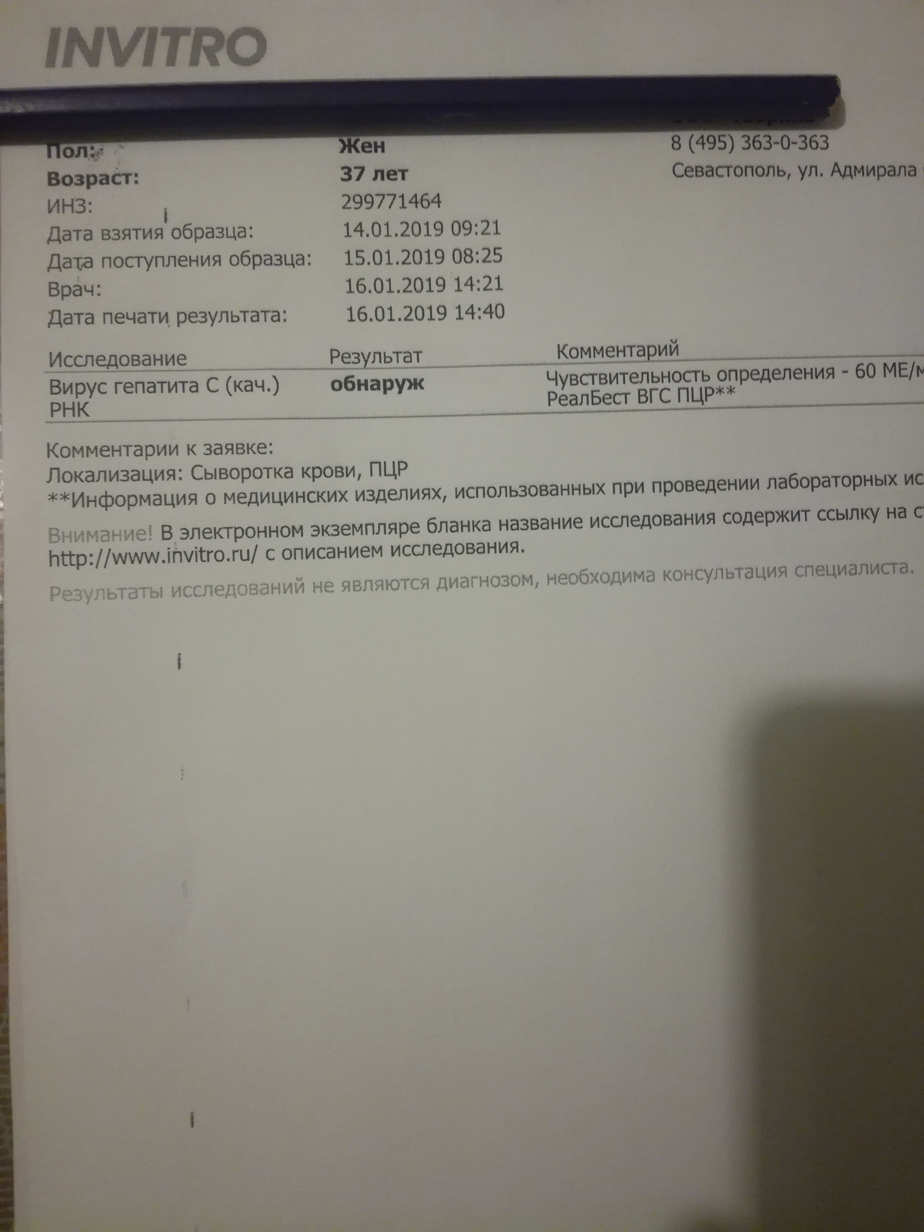 17/01/2019 -Кач.ПЦР - Не обнаружено (Инвитро 60 ме)